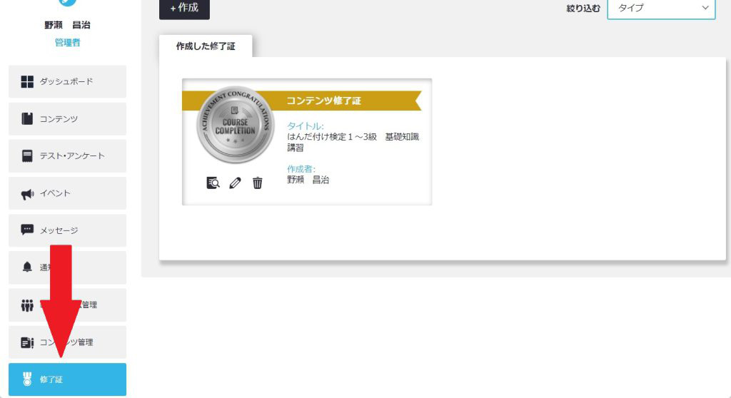 左メニューの終了証タブをクリックすると、発行された修了証が確認できます。