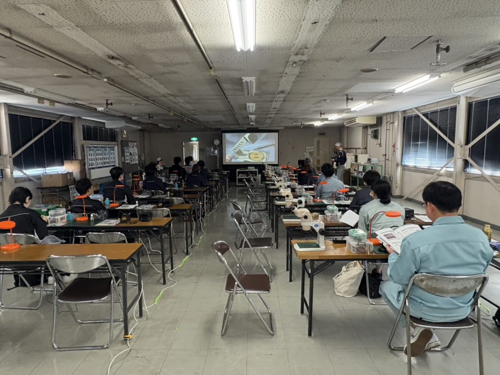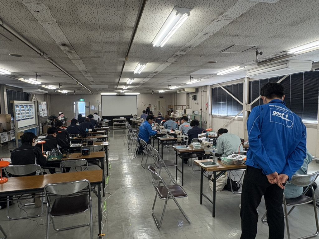 本日と明日の2日間、広島県福山市に本社を構える、ハンダゴテの老舗メーカー・太洋電機産業株式会社様のご厚意により、社屋をお借りして「はんだ付け講習」と「はんだ付け技能検定」を開催しております。治工具の貸出、講師としてのサポートも頂いております。
